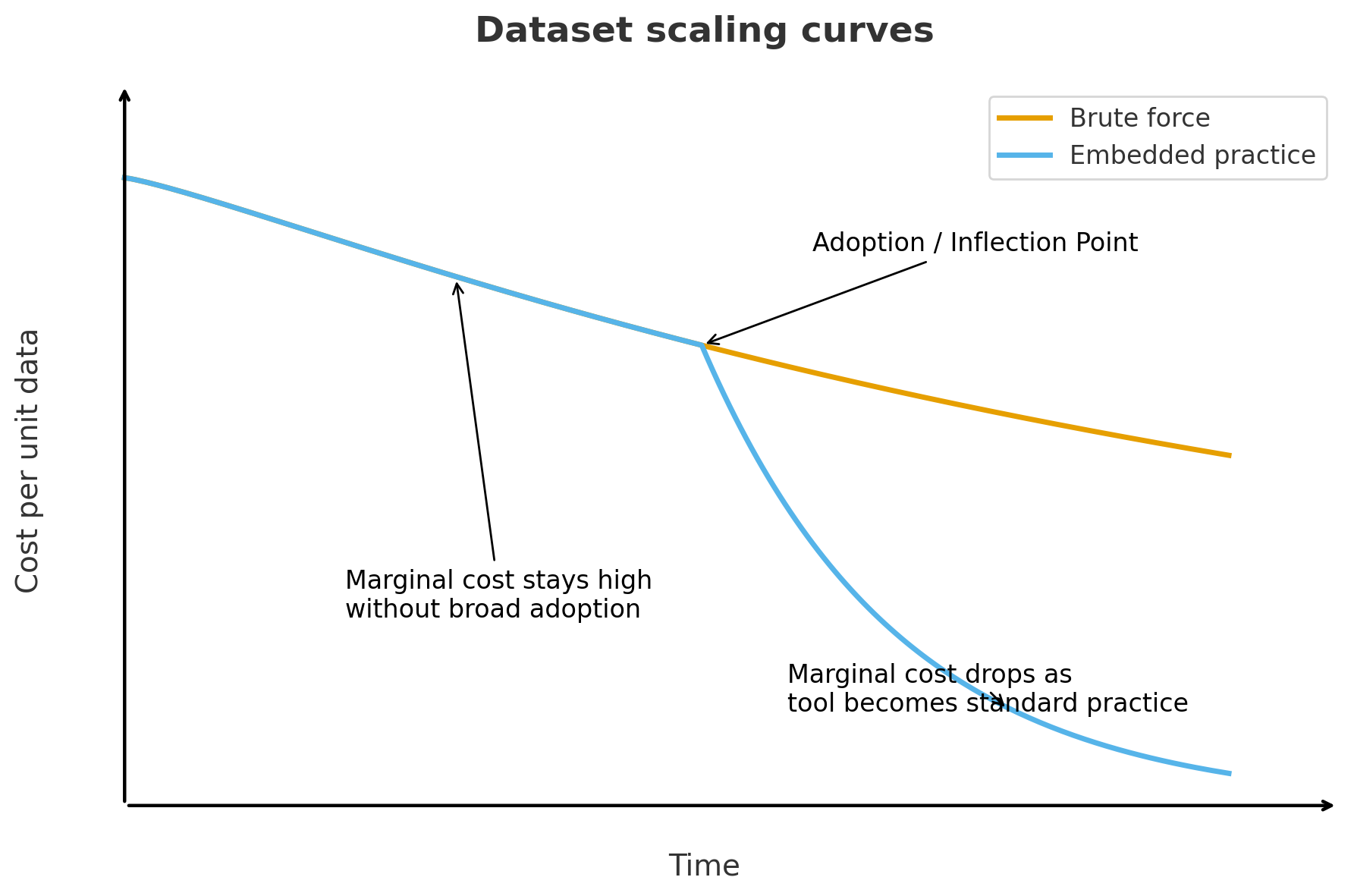 The PDB scaled because crystallography naturally produced standardized data as a byproduct of routine work across methods, hardware, file formats, and infrastructure. This reduced marginal costs as the practice spread. It’s very different from a brute-force approach to data generation, where costs keep rising and the volume of data increases.